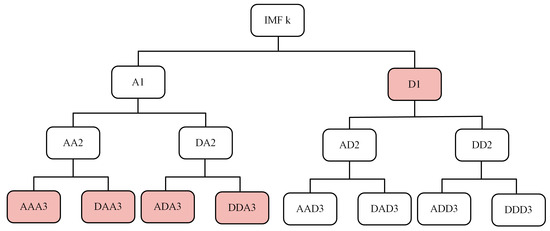 WPD is developed from the basic principles of the wavelet transform to address its limitations in high-frequency resolution [37]. While traditional wavelet techniques often struggle with high-frequency signal decomposition, WPD allows for a more detailed and nuanced multi-level division of frequency bands, improving both low- and high-frequency signal analysis.