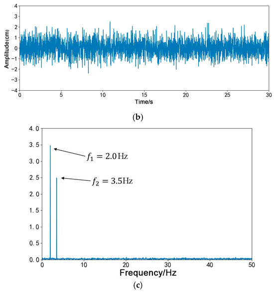 Figure 3a displays the time series of the original and noisy signals, showing consistent trends but with an increased fluctuation range of approximately 2 cm in the noisy signal. Figure 3b illustrates the added white noise, which fluctuates between −2 cm and 2 cm, while Figure 3c presents the corresponding power spectral density, revealing two distinct frequency peaks at 2.0 Hz and 3.5 Hz. This analysis highlights how the introduced noise affects the signal’s amplitude without altering its fundamental frequency components.