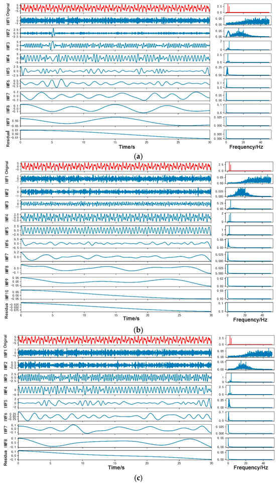 Upon analyzing the decomposition results in Figure 4, it is evident that the first two IMF components predominantly consist of high-frequency white noise. However, in Figure 4a, the IMF 2 component from the EMD decomposition reveals a noticeable mixture of useful signals, while the separation achieved by EEMD in Figure 4b and CEEMDAN in Figure 4c is more effective, with the signal and high-frequency white noise being largely separated. Due to the presence of noise in the signal, EMD and EEMD exhibit mode mixing issues, and the EEMD method produces more IMF components than both EMD and CEEMDAN, potentially generating more spurious components. While EMD is complete and allows for the accurate reconstruction of the original signal without adding white noise, EEMD and CEEMDAN involve white noise in their decomposition processes, which necessitates an evaluation of their reconstruction errors.