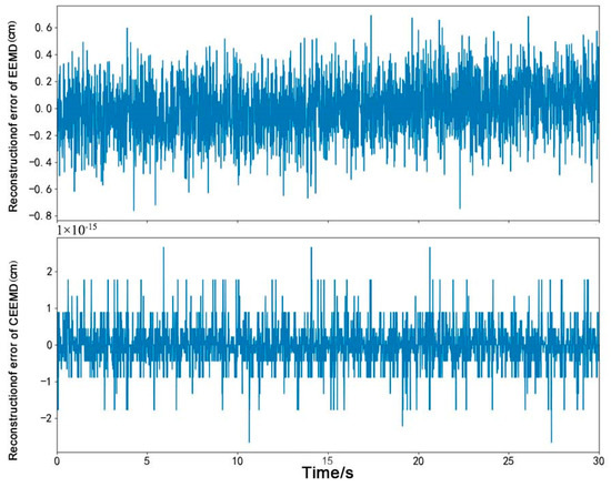 By summing the decomposed IMF components and the residual, the reconstructed signal is obtained, and the reconstruction error is determined by subtracting this from the original noisy signal, as shown in Figure 5. The reconstructed signal from EEMD contains a significant amount of residual white noise, leading to a larger reconstruction error, while the CEEMDAN reconstructed signal shows minimal reconstruction error, ensuring the completeness of the method. Specifically, the EEMD reconstruction error exhibits more frequent fluctuations, ranging between −0.6 cm and 0.6 cm, whereas the CEEMDAN reconstruction error is much better, with a fluctuation range of −2 × (1 × 10−15) cm to 2 × (1 × 10−15) cm. Overall, this analysis demonstrates that while EEMD introduces more residual noise leading to higher reconstruction errors, CEEMDAN provides a more accurate reconstruction with minimal errors, highlighting its superiority in maintaining signal integrity during the decomposition and reconstruction process.