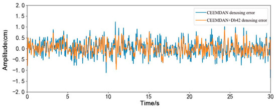 Figure 7 illustrates the denoising performance of the CEEMDAN method and the CEEMDAN combined with Db42. It is evident that the addition of Db42 significantly improves the denoising effect, resulting in a clearer time series with a reduction in peak deviations by approximately 1 cm, while retaining the original signal’s trend. Overall, the proposed CEEMDAN-WPD provides superior noise reduction and more accurate signal representation.