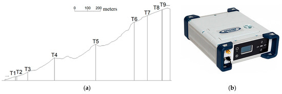 Cross-section of the ropeway (a) and the monitoring GNSS receiver as Trimble SP90M (b).
