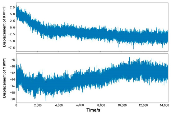 Figure 9 shows the horizontal displacement of a pillar from 00:00 to 04:00 on 2 December 2023, which is the one with the longest span and the highest elevation, resulting in relatively poor observation conditions; the fixed solution data are analyzed. Figure 9 illustrates the data, where the X and Y directions correspond to the longitudinal and transverse directions of the ropeway coordinate system, respectively.