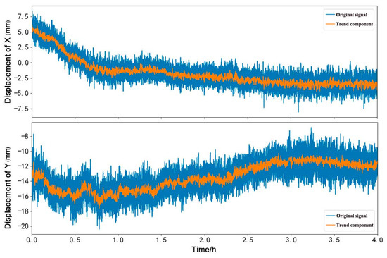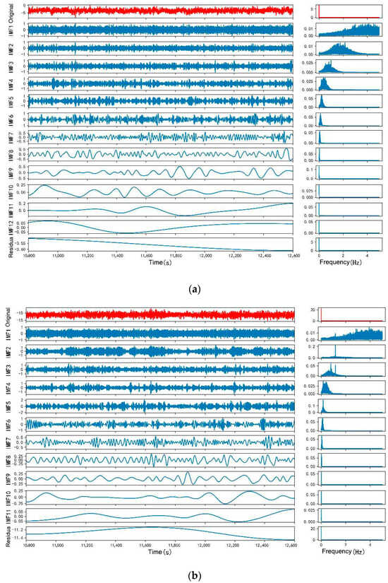 In this section, we process field data collected from the GNSS deformation monitoring of ropeway systems. The first step involves decomposing the GNSS signals using the CEEMDAN method, and Figure 11 presents the results for both the X and Y directions.