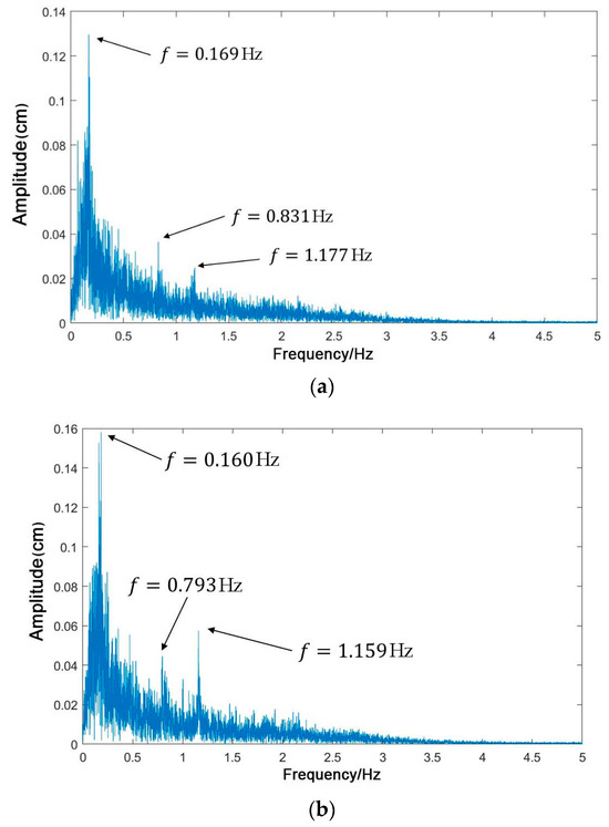 Due to the small amplitude of vibrations and minimal environmental excitation, GNSS data may only reveal the excited modes during a limited period. The FFT was used to perform spectral analysis on the denoised data by the proposed CEEMDAN-WPD method, resulting in the frequency spectrum of the vibration sequences, as shown in Figure 14. By analyzing the frequency spectrum, the modal frequencies were identified. In the X direction, the three most prominent frequencies are 0.169 Hz, 0.831 Hz, and 1.177 Hz. In the Y direction, the three most prominent frequencies are 0.159 Hz, 0.793 Hz, and 1.159 Hz. The primary frequencies in both directions are quite consistent.