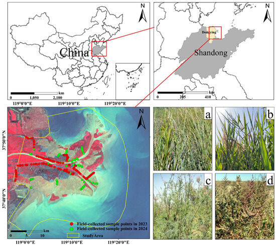 Locations of study area and the spatial distribution of field sample data. (a–d) Photos of the four main vegetation types. (a) S. alterniflora. (b) Reed. (c) Tamarix. (d) Suaeda.
