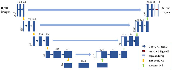 The U-Net model is a deep learning architecture designed for image classification, utilizing an encoder–decoder framework (Figure 3). The encoder path extracts features by reducing the spatial resolution, while the decoder path restores resolution through upsampling, using skip connections to retain detailed information. This approach allows the model to effectively capture both global context and local details, making it highly suitable for pixel-level classification tasks.