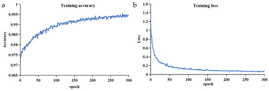 The performance of the U-Net model during training, based on the optimal feature dataset, is shown in Figure 5. As illustrated, the model demonstrated a robust classification performance, with the training process converging after approximately 250 epochs and stabilizing at a loss value close to 0.01. These results indicate that the model was well-trained and achieved a high classification accuracy.