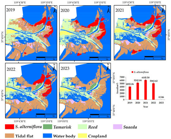 Maps of the plant communities in the YRD provide a clear and comprehensive depiction of the distribution of the main vegetation types in the study area, such as S. alterniflora, Reed, Suaeda, and Tamarix (Figure 6). From 2019 to 2023, the distribution area of S. alterniflora in the YRD showed an initial increase followed by a decline, with the area reaching 4055.06 hm2 in 2019, 5242.04 hm2 in 2020, 6105.50 hm2 in 2021, 5063.62 hm2 in 2022, and 0.546 hm2 in 2023. In 2019, S. alterniflora occupied an area of 4055.06 hm2, primarily concentrated in the southeastern region of the Gudong Oilfield, extending along both banks of the Yellow River Estuary (YRE), with smaller patches located in the southern mudflat zones. Reed dominated the landscape in the western part of the study area, forming large, continuous patches within a 1 to 1.5 km range on both sides of the new Yellow River channel, as well as within a 500 m range on both sides of the old river channel in the south, covering a total area of approximately 11,009.79 hm2. Suaeda was mainly found in extensive patches throughout the intertidal zone, encompassing an area of around 2847.96 hm2. Tamarix, with the smallest distribution, was sparsely interspersed between the patches of Reed and Suaeda, forming narrow, belt-like strips, and covering only 617.00 hm2.