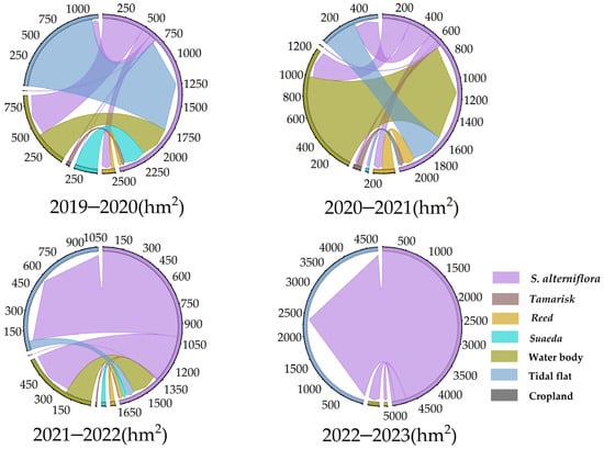 To elucidate the characteristics of habitat type shifts, we analyzed the variations in habitat types across the study area and presented these findings visually (Figure 7 and Figure 8). Between 2019 and 2020, 674.22 hm2 of S. alterniflora was converted, mainly into water bodies, followed by Reed areas, with transformations of 482.94 hm2 and 109.88 hm2, respectively. Meanwhile, the species expanded by 1862.67 hm2 during this period, with the largest portion of 1144.71 hm2 (61.45%) occurring on tidal flats, and 385.05 hm2 and 360.42 hm2 expanding into water bodies and Suaeda habitats, respectively. From 2020 to 2021, the area of S. alterniflora conversion experienced a slight decrease, with 637.93 hm2 being transformed, predominantly into water bodies (267.74 hm2) and tidal flats (232.56 hm2). At the same time, the species expanded by 1499.77 hm2, primarily into water bodies (993.05 hm2) and tidal flats (335.03 hm2). In the following period, from 2021 to 2022, the species expanded by only 337.24 hm2, but saw a significant reduction of 1378.99 hm2, with most of the expansion occurring in water bodies (205.52 hm2), accounting for over 60% of the total. The reduction was concentrated on tidal flats (999.62 hm2, over 70%), followed by water bodies (368.84 hm2). Between 2022 and 2023, S. alterniflora underwent a dramatic decline, with nearly all areas being converted, primarily into tidal flats (4734.43 hm2, 94%), and smaller portions transitioning into water bodies and Reed areas. Overall, from 2019 to 2023, S. alterniflora expanded by a total of 3699.68 hm2 and contracted by 7743.05 hm2. The largest expansion occurred between 2019 and 2020 (1862.67 hm2), while the most significant reduction occurred between 2022 and 2023 (5051.91 hm2).