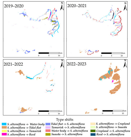 Spatial distribution of transitions between S. alterniflora and other land cover types for the four temporal intervals: 2019–2020, 2020–2021, 2021–2022, and 2022–2023.