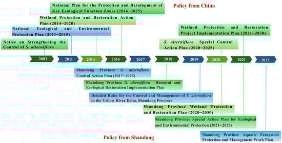 Overview of S. alterniflora management policies issued by China and Shandong Provinces.