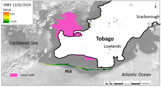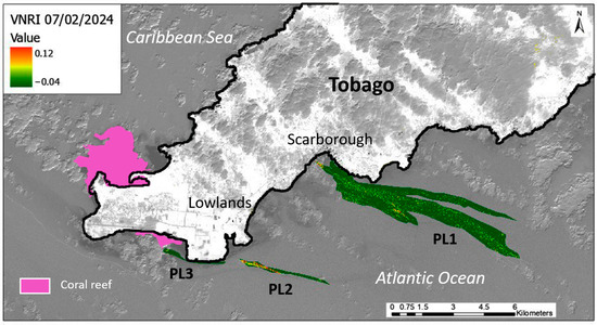 With the aim of detecting the oil spill off the island of Tobago, VNRI [5] and the new IVI indexes were applied to a Sentinel-2 image collected on 7 February 2024. On 7 February (Figure 1), a plume (PL1) (11°09′36.1″N 60°42′19.5″W) is already clearly visible off Scarborough. This plume had an orientation parallel to the coast with its tip to the northwest pointing towards Scarborough harbor. From the imagery, PL1 is seen close to the coast, but due to cloud contamination in the satellite image, we cannot accurately estimate the exact distance from the coast. From the available imagery, we can estimate about 1.4 km from the Scarborough deep water harbor. PL1 has a length of 11 km, with a denser central area with a reflectance that presents an irregular and large surface that reaches 500 m on average. The area of PL1, estimated using VNRI and IVI indexes of PL1, is approximately 11.1 km2. Its southeastern summit points towards the open sea. On 7 February, the longitudinal axis of PL1 pointing towards the open sea is still a few kilometers from the island and does not appear to have hit the coast and coral reefs yet. The orientation, length, and width dimensions and appearance of PL1 (Figure 1) are consistent with those shown in the Tobago Emergency Management Agency (TEMA) report dated 9 February 2024 (Supplementary Figure S1). On that date, the length of the plume measured with boats was approximately 11.6 km long and the spill was heading towards the Caribbean Sea, impacting the coral reef and beaches of the island [14]. The VNRI index already confirms the presence of oil off Scarborough on 7 February, refuting the hypotheses of TEMA which unfortunately only activated the International Charter Space and Major Disasters on 10 February 2024.