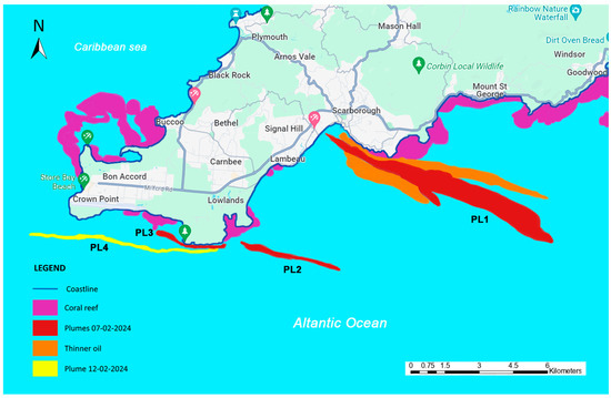 Reconstruction map of the oil spill accident occurring 7 February 2024 which impacted the coral reef and beaches of Tobago, based on Sentinel-2 VNRI and IVI reflectance ratio. In IVI and VNRI maps produced from Sentinel-2 images collected on 12 February 2024, a plume (PL4, in yellow) is observed heading towards the Caribbean Sea, threatening the western coasts of Venezuela as also highlighted by Sentinel-1. Note the significant overlap in terms of lengths and areas affected by the oil spill with the maps provided by TEMA on 9 February 2024 (Figure S1).