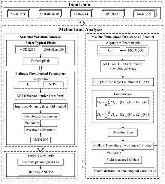 Seasonal variation analysis of the CI and flow chart of the MODIS time-share two-stage CI product.