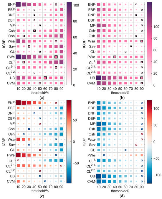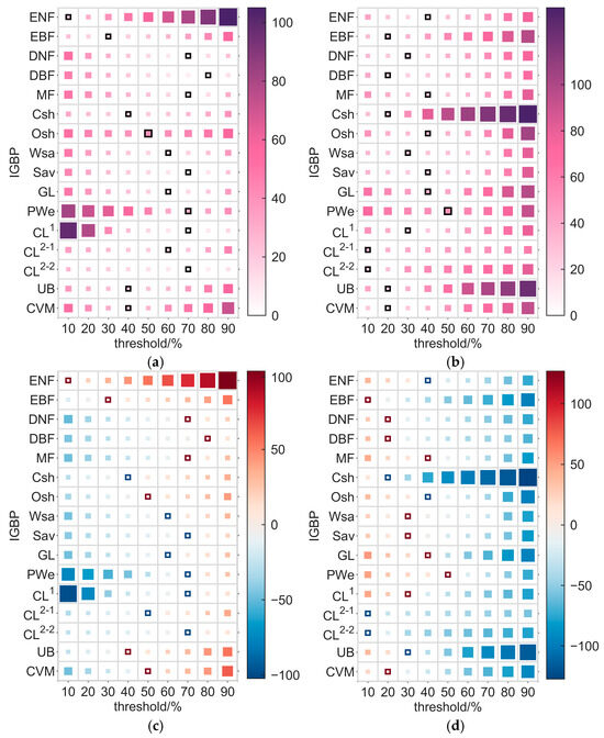 Accuracy evaluation results of the estimation of typical pixel vegetation phenology parameters from the CI time series. The accuracy evaluation metrics are the root mean square error (RMSE) and bias, with the minimum errors for each IGBP class highlighted by a bold square, and the smaller the error is, the smaller the square. Red indicates overestimated SOS and EOS values, whereas blue represents underestimated values. ENF: evergreen needleleaf forests; EBF: evergreen broadleaf forests; DNF: deciduous needleleaf forests; DBF: deciduous broadleaf forests; MF: mixed forests; Csh: closed shrublands; Osh: open shrublands; Wsa: woody savannas; Sav: savannas; GL: grasslands; PWe: permanent wetlands; CL1: annual croplands; CL2-1: the first vegetation cycles of biannual cropland; CL2-2: the second vegetation cycles of biannual cropland; CVM: cropland/natural vegetation mosaics. (a) RMSE of the estimated SOS from the CI. (b) RMSE of the estimated EOS from the CI. (c) Bias of the estimated SOS from the CI. (d) Bias of the estimated EOS from the CI.