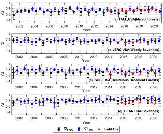 Temporal variation in the time-share two-stage CIs at the (a) mixed forest, (b) woody savanna, (c) deciduous broadleaf forest, and (d) savanna field sites. Details of the field-measured CI data are shown in Appendix A. Red pentagons indicate the field-measured CI data. The black and blue dots indicate the CILOS and CILFS, respectively.
