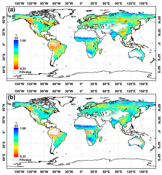 The global MODIS CI product used in the study was adapted from Jiao et al. [31], with a spatial resolution of 500 m, and a temporal resolution of 8 days and monthly intervals from January 2001 to December 2020. The product was derived from the MODIS BRDF and its quality assurance (QA) products (MCD43A1 and MCD43A2) and the MODIS land cover products (MCD12Q1) via primary and backup algorithms. Areas without vegetation cover, such as ice and snow (IGBP15), barren or sparsely vegetated areas (IGBP16), and water bodies (IGBP17), were masked [31]. The first band contains CI values with a valid range of 3300–10,000 and a scale factor of 0.0001; thus, CI values range from 0.33 to 1.0. The second band contains QA data, with values ranging from 0 to 3 that indicate quality from high to low. This dataset can be accessed at http://www.geodata.cn (accessed on 1 November 2023).