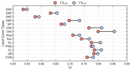 - Globally, based on the MODIS time-share two-stage CI product, the CI generally shows distinct seasonal variations, with the CILOS being smaller than the CILFS across all land cover types. Needleleaf forests presented the smallest CI values, and the difference between the CILOS and CILFS was insignificant. Compared with needleleaf forests, broadleaf forests, with slightly higher CI values, present more pronounced seasonal variations. In addition, Osh presented the largest CI values, whereas CSh, GL, PWe, CL, UB, and CVM presented relatively high CI values. Broadleaf forests, MF, Wsa, and Sav had relatively low CI values.