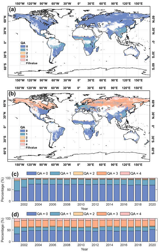 Global distribution of the mode of QA for (a) LOS and (b) LFS, and histogram distribution of QA for the MODIS time-share two-stage CI product for (c) LOS and (d) LFS from 2001 to 2020.
