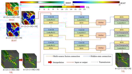The proposed DA-RNN model is a multiple-output encoder–predictor model. Its main components are convolution, deconvolution, and leakyReLU activation functions, an RNN network, and a DANet feature extraction network. The convolution and deconvolution functions respectively act as downsampling and upsampling layers that extract the spatial features from the image. The leakyReLU activation function uses a certain slope in the negative part to avoid the gradient vanishing problem that affects neurons during training, and also helps to strengthen the nonlinear fitting relationship of the model [41]. We chose the TrajGRU [21] and ConvLSTM [20] networks in the RNN because they represent the two basic RNN networks, namely, the GRU and LSTM modules. The GRU module differs in structure from the LSTM module in that the GRU module has one less forget gate than the LSTM module. Therefore, the performance of the two different models needs to be verified. Figure 1 shows the technical route in the experiment, which involved randomly selecting 25 consecutive radar VIL images and the first 1h (13 images) of IR107 and IR069 as the training set, then inputting them into the DA-RNN for training to obtain the predicted 12 images. Finally, the loss function was updated to sequentially train the models until the complete dataset was trained.