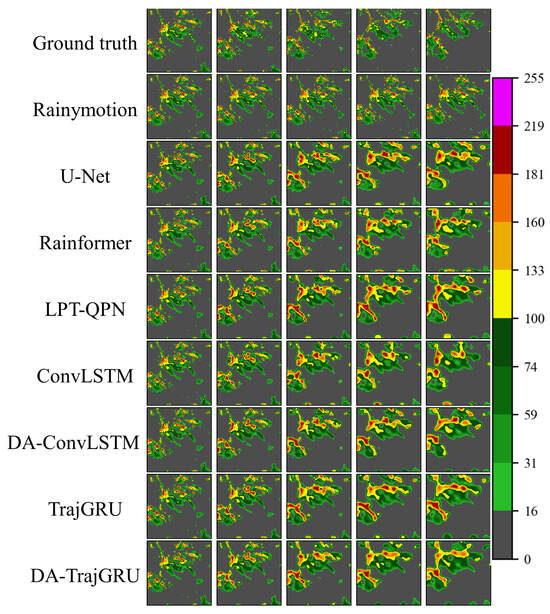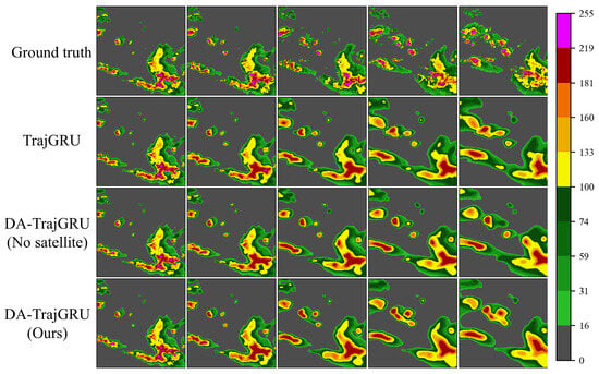 The CSI and HSS of DA-TrajGRU were the largest, indicating more accurate predictions. The FSS of DA-TrajGRU was relatively large for the individual thresholds, indicating that the spatial structure of its predicted images was highly preserved. Additionally, the FAR value of the DA-TrajGRU model was relatively low, indicating that the rate of false positives was low. This result demonstrates that the DA-TrajGRU model had the best performance. Finally, the growth in each index was analyzed for the DA-TrajGRU model. The results showed that while the CSI, HSS, and FSS did not considerably improve, the FAR substantially decreased. This can be attributed to the introduction of satellite infrared data, which increases the amount of information learned by the model, thereby helping to prevent the model from overestimating some pixel values. In the results, some fuzzy areas were directly predicted into the area of larger pixel values.