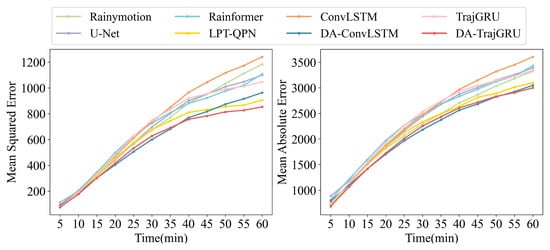 In meteorological research, the growth patterns of various metrics with increasing lead time are also very important; therefore, we present images showing the changes in MSE and MAE for each model on the test set over time. From Figure 3, it can be observed that the performance of the DA-RNN model incorporating infrared satellite data and the DANet network model improves significantly as time increases, particularly the DA-TrajGRU model. As the lead time increases, the performance gap between the DA-TrajGRU model and the other models widens, indicating better performance.