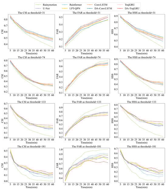 Finally, because meteorologists often focus on model performance under different precipitation thresholds, we provide the CSI, FAR, HSS, and FSS values of the different models on the test set at different pixel value thresholds (VIL values positively correlated with pixel values) of 31, 74, 133, and 181 (Table 7, Table 8, Table 9 and Table 10). The CSI, HSS, and FSS constantly decreased with the increase in precipitation intensity, while the FAR constantly increased. This is a problem that meteorologists must overcome, and is caused by lack of information about the heavy precipitation area in the image. For this reason, less information is extracted during the deep learning process, resulting in poor prediction ability [48,49].