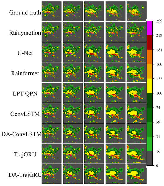 Visualization of the results of Case 1. The first row of the image represents the true values of weather radar VIL at 5, 15, 30, 45, and 60 min from left to right, followed by the corresponding time prediction graphs for Rainymotion, U-Net, Rainformer, ConvLSTM, DA-ConvLSTM, TrajGRU, and DA-TrajGRU.