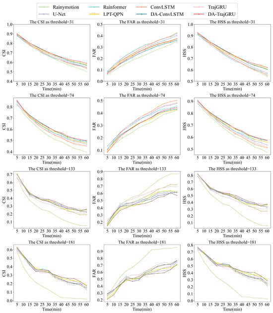 Figure 6 provides the CSI, FAR, and HSS results of the different models under different pixel thresholds over time. The figure shows that all indicators deteriorate as the threshold increases, which is consistent with the visual results. In addition, we analyzed the results under different thresholds. When the threshold was small, the CSI and HSS of the DA-ConvLSTM model were the largest and its FAR was the smallest. When the threshold was greater than or equal to 74, the performance of the DA-TrajGRU model was more accurate. This result proves the superior performance of the DA-RNN model. We noticed that the performance of the DA-RNN model improved more than that of the other models over time, which is because the introduction of satellite infrared information provides the model with more learnable features. Finally, the FAR of the DA-RNN model was notable. The introduction of satellite infrared information provides the model with more information about the areas in the image that experience faster changes, thereby avoiding overestimation of some pixel values, which is consistent with the results on the test set.
