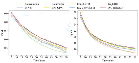 Figure 9 provides images of the SSIM and PSNR in Case 2 for the different models over time, helping to more intuitively display the difference between the ground-observed VIL images and the predicted images. The values of the DA-TrajGRU model are relatively large, followed by the DA-ConvLSTM model. This proves that the image predicted by the DA-RNN model in Case 2 was the most similar to the observed VIL image in terms of structure, brightness, and value.