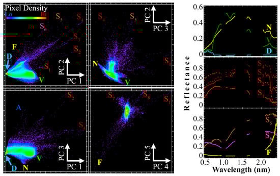 Principal Component based spectral feature space of the AVIRIS-3 dataset. The natural permafrost + thermokarst background forms a mixing space between Dark (D), green vegetation (V), and nonphotosynthetic vegetation (N) endmembers. This mixing continuum dominates image variance. Anthropogenic substrates (S1–S6) and processes, like Flaring (F), are spatially sparse but spectrally highly distinct, forming excursions from the mixing space. Some human materials are characterized by consistent absorption features, like the SWIR absorption at 2.2 microns and longer wavelengths characteristic of many polymers. Anthropogenic materials are prominent in the PC transform, but full characterization is made challenging by depth of the embedding space (many PCs to explore) and redundancy (same spectra identified by multiple pairs of PC dimensions). Here we show examples through PC5, but no obvious stopping point is evident.