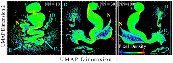 In this analysis, we used both 2D and 3D embedding spaces. Perhaps the most sensitive UMAP hyperparameter is the number of nearest neighbors (NN) used in the analysis. For this analysis, we explored a range of hyperparameter choices, settling on NN = 30, min_dist = 0.1, metric_choice = Euclidean, and n_dimensions = 2 or 3 for the final products. For more details about UMAP, the interested reader is directed towards [28]. UMAP is fully open source and available for download free-of-charge through the package ‘umap-learn’ available at https://umap-learn.readthedocs.io/en/latest/ [accessed 23 October 2024].