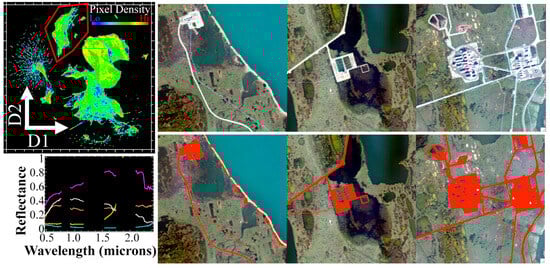 Next, we compute the spectral mixture residual using the N, V, and D local endmember spectra derived from the above PC analysis of the reflectance. As shown in the 2D UMAP embedding in the upper left of Figure 5, the mixture residual effectively removes the bulk of the contribution of the mixing continuum to the UMAP embedding. Here, statistical connectivity relations are broken between pixels associated with anthropogenic materials and pixels associated with natural tundra landscape, resulting in effectively complete statistical separation of the anthropogenic and natural landscapes. At the same time, connectivity relations among pixels within the anthropogenic cluster are preserved, structuring the manifold into interpretable endmember tendrils (example spectra shown in lower left). This allows for straightforward mapping of the built environment, and isolation of these pixels for targeted subsequent characterization.