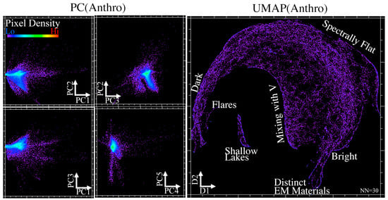 Spectral diversity within the anthropogenic pixels identified from the UMAP(MR) space as shown by both PCs (left) and targeted UMAP (right). Spaces are sparser because most of the image is now excluded. UMAP clearly shows the albedo continuum, culminating in multiple tendrils near the bottom of the space, each of which corresponds to a distinct reflectance spectrum. Mixed pixels are clearly identifiable from each edge of the manifold. In contrast, the PC space manifests as a spiky hyperball, with individual mixing lines emanating from the body of the point cloud. In some cases, by not requiring statistical connectivity, the PCs are better able to identify compositional gradients among small numbers of pixels.