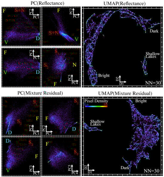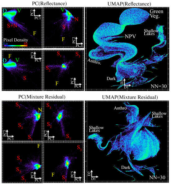 The effect of 30 m resolution (roughly representative of most current and planned spaceborne imaging spectrometers) is shown in Figure 8. Here, the mosaic was spatially convolved with a low-pass Gaussian blurring kernel with a Full Width at Half Maximum of 8 pixels (32.8 m) to simulate a hypothetical spaceborne imaging spectrometer. The top panel shows PC-based (left) and UMAP-based (right) characterization of this spatially coarsened reflectance product. Here, the D to V spectral continuum that dominates the image area is still present in both PC and UMAP, but the N and S spectra are less separable. Less complexity is also evident in the water bodies. Application of the mixture residual (bottom panel) is ineffective at resolving additional endmembers in either PC (MR) or UMAP (MR) space. On this particular landscape, it is evident that a 30 m ground sampling distance so severely undersamples the characteristic scale of infrastructure that even imaging spectrometers are likely to struggle with identification of the full complexity of anthropogenic spectra. A more comprehensive illustration of the effects of spatial resolution on all dimensionality reduction approaches used in this study is shown in Appendix A.