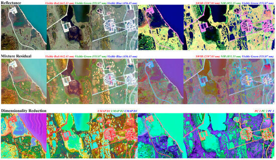 Figure 10 summarizes the visual appearance of the map-projected data in this analysis. The top row shows the original AVIRIS-3 reflectance as true color (left) and false color (right) composites. Clearly, the bulk of the mosaic is dominated by natural tundra and shallow water, with spatially sparse infrastructure elements. The center row shows both true color (left) and false color (right) wavelengths of the spectral mixture residual. Here, substantial additional complexity is evident within the tundra and lakes, as well as within the buildings, pipelines, and roads of the built environment. The bottom row shows a comparison of the dimensionality reduction outputs of PCs (right) and UMAP dimensions (left). Here, the spectral diversity of the anthropogenic materials can be isolated and characterized in a targeted way. Notably, considerable additional spectral diversity exists in the tundra landscapes around the infrastructure. Fully characterizing the diversity in these natural landscapes has the potential to be an important and interesting future application of this approach. Interestingly, lakeshore sediments present an interesting crossover between the two cases, appearing at intermediate feature space locations between the anthropogenic materials and the remainder of the tundra background. Characterizing spectral variability in these targets also represents an interesting and potentially important avenue for future work.