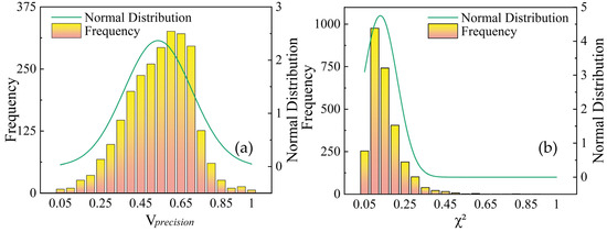In Equation (10), Z-score is the normalized result; Raster denotes the data to be normalized; Zmax is the maximum value; and Zmin is the minimum value. To enhance data reliability, we performed statistical calculations in Excel and plotted normal distribution graphs. We grouped all data with a step size of 0.05, counted the number of data points in each interval, and then drew a histogram. As shown in Figure 4, most selected points have VPrecision values between 0.15 and 0.8 and χ2 values between 0 and 0.3, indicating that the accuracy values are reliable.