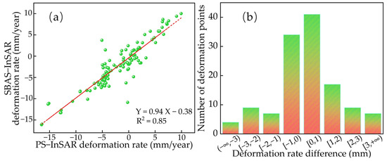 Furthermore, a comparison was made between the results obtained using the SBAS-InSAR and PS-InSAR methods to validate the accuracy of the experiment. To more effectively validate the results of these two methods, 128 Permanent Scatterer (PS) points were randomly selected, and the correlation between the rates obtained from SBAS-InSAR and these points was analyzed. The results are shown in Figure 5. Figure 5a presents a statistical analysis of the deformation rate differences for 124 pairs of adjacent points. More than half of the adjacent points exhibited absolute differences within the range of 0 to 1 mm/year, with a mean and standard deviation of 1.35 mm/year and 0.66 mm/year, respectively, indicating a satisfactory comparison outcome. The deformation rate results from both methods are highly consistent. Figure 5b shows an value of 0.85 obtained through cross-validation, further indicating a good comparison outcome. Considering the differences in the random selection of PS points and the limitations of InSAR technology accuracy, there are slight discrepancies between the two methods. Therefore, it can be assumed that the deformation rate results obtained by both methods are similar in most areas.