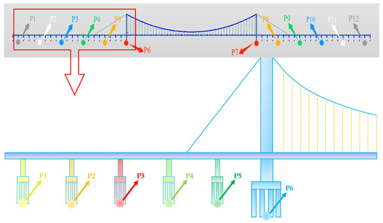 Distribution of structural monitoring points: (upper) reference points P1 and P12 at 30 m from bridgeheads, with measurement points P2–P11 at 120 m intervals along bridge span; (lower) detailed view of monitoring points at bridge foundation.