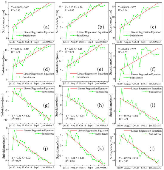 Time-series deformation maps of monitoring points P1–P12. Subplots (a–l) illustrate cumulative displacement trends, where dotted lines represent measured settlement values and solid lines denote linear regression fits with corresponding equations.