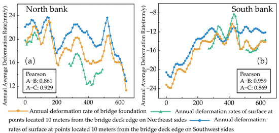 Comparison of annual average deformation rates of bridge foundations on the north bank (a) and south bank (b) with surrounding ground deformation rates.