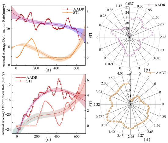 Figure 10a,c display the observation point data for the north and south banks, respectively. The content represented by the horizontal axis in Figure 10 is consistent with that in Figure 9. Analysis of the north bank reveals that the STI values in this region exhibit significant fluctuations, with two main peak areas. The annual average deformation rate is relatively stable but shows a slight downward trend in regions with higher STI values. In the region with the highest STI values (approximately points 15–20), there is a noticeable decrease in the annual average deformation rate. Overall, there is a negative correlation between STI values and the annual average deformation rate, but this relationship is not entirely linear. In the south bank region, the STI values vary more drastically, with multiple distinct peaks and troughs. The changes in the annual average deformation rate are also more significant, showing an overall upward trend. However, in areas with higher STI values (such as points 100–110 and 125–128), the annual average deformation rate shows a noticeable decrease. Compared to the north bank, the negative correlation on the south bank is more evident, especially in regions where STI values fluctuate greatly. In summary, there is a negative correlation between STI values and the annual average deformation rate; that is, the higher the STI value, the lower the annual average deformation rate. This relationship is more pronounced on the south bank, possibly due to geological conditions or environmental factors in that region. The polar chart in the figure illustrates the relationship between the annual average deformation rate and the STI, providing a more intuitive visualization of their correlations. We employed a nonlinear regression model to analyze the relationship between STI and AADR, calculating the MSE and the between them. An MSE value closer to 0 indicates better model selection and fit, resulting in more successful data predictions. is a statistical indicator used to assess the goodness of fit of a linear regression model, representing the proportion of variance in the dependent variable explained by the predictive values, ranging from 0 to 1 [72]. When the value approaches 1, the model demonstrates a good fit; conversely, a value close to 0 indicates minimal explanatory power. The calculations revealed that the MSE and values for the north bank were 2.64 and 0.43, respectively, while for the south bank, they were 2.54 and 0.54, indicating that both data prediction and fitting performance were satisfactory.