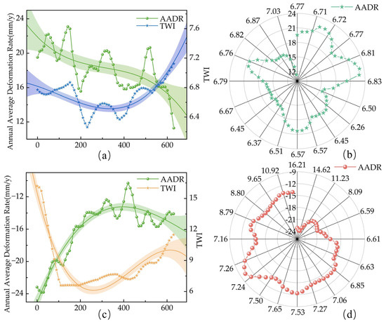 Figure 11a,c display data from observation points on the north and south banks, respectively. The content represented by the horizontal axis in Figure 11 is consistent with that in Figure 9. Analysis of the north bank shows that TWI values exhibit a fluctuating upward trend, increasing from approximately 6.71 to 7.12. The annual average deformation rate shows a decreasing trend, declining from about 22 mm/year to 11 mm/year. There is a positive correlation between TWI values and deformation rates, but the relationship is not entirely linear. In areas where TWI values decrease sharply (e.g., points 16–24), the deformation rate decreases significantly. In segments where TWI rises, the deformation rate also increases. However, in the region of points 55–64, TWI values increase while the deformation rate decreases, possibly influenced by other factors.