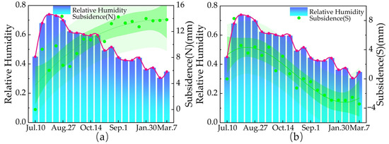 This study expands the analysis of the surrounding areas of the bridge to gain a more comprehensive understanding of the relationship between ground deformation and bridge displacement. By collecting and processing annual average deformation rate data from points located 10 m on either side of the bridge deck, perpendicular to the bridge axis, it was found that the Pearson correlation coefficients of surface deformation rates on both sides of the bridge with the deformation rates of the bridge foundation were above 0.86, indicating a significant correlation between ground deformation and the deformation patterns of the bridge foundation. Specifically, during the study period, the displacement of the bridge foundation exhibited highly consistent characteristics with the deformation patterns of the surrounding ground. Figure 9 illustrates the relationship between the surface deformation rates in the areas surrounding the bridge on both the north and south banks and the deformation rates of the bridge foundation. In the figure, the horizontal axis coordinate indicates that the zero point on the north bank is located at (115°42′13.46″E, 40°20′58.20″N), with an observation point taken every ten meters in the direction from north to south towards the bridge. The zero point on the south bank is located at (115°43′0.88″E, 40°20′33.76″N), with an observation point similarly taken every ten meters in the direction from north to south towards the bridge. The coordinates for both points represent the distance from a specific point to the starting point. The absolute differences in deformation rates ranged from 0 to 5.52 mm/year, suggesting that regional geological conditions and environmental factors may have a systematic impact on the bridge structure, with the movement trends of the surrounding ground aligning with the displacement trends of the bridge foundation.