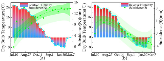 When the coefficient matrix B is full rank (i.e., M ≥ N), the deformation rate ν can be solved using the least squares method; when M < N, the matrix B becomes rank-deficient, and the deformation rate of the study area can be obtained using singular value decomposition (SVD) [50]. After obtaining the deformation rate, the deformation amount during the corresponding time intervals between SAR images in the study area can be calculated.