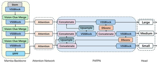 The model comprises four components: the Mamba backbone, the Attention network, the PAFPN, and the head. The Mamba backbone can focus on longer contexts in order to extract deep semantic information effectively. The VSSBlock module employs a spatial state model to capture and process image features, thereby enabling the model to extract complex image features. The integration of lightweight attention modules into the attention network serves to augment the efficacy of pine wilt feature recognition. In this study, four attentional modules were tested in conjunction with previous studies and the research experience of the team. The most effective module was then selected for incorporation into the fusion model. The model’s capacity to recognize multi-scale objects is further enhanced by the PAFPN, which can process images of varying sizes captured from different distances by the UAV, thus facilitating the objective of identifying infected trees. In the final stage of the process, the 20 × 20, 40 × 40 and 80 × 80 feature maps are employed to identify targets of varying sizes, namely large, medium and small. The fusion model structure is shown in Figure 4.