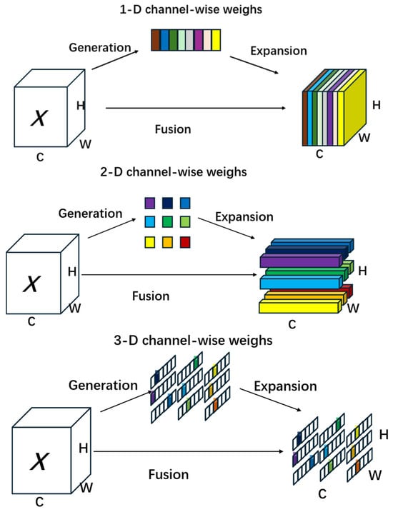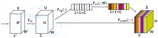 SE stands for “Squeeze-and-Excitation”, which is an attention mechanism used to improve convolutional neural networks (CNNs). The SE network architecture was put forth by Jie Hu et al. [47] in 2018, and its core idea is to introduce a global attention mechanism into convolutional neural networks to self-adaptive learn the relative importance of every channel. The SE network implements an attention mechanism through two steps: squeeze and excitation. In the compression step, the SE network performs a global pooling of the feature maps of each channel, compressing them into a scalar. In the excitation step, the SE network performs the conversion of the compressed feature vector into a weight vector, which is used to weigh each channel’s feature map through a full connectivity layer. The incorporation of the SE block into our fusion model serves to reinforce the model’s emphasis on pine wilt characteristics, while simultaneously attenuating the influence of extraneous features within the channels [50]. The workflow of the SE module is shown in Figure 6. The following calculations are to be made for the SE module: