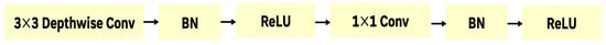 Depthwise separable convolution (DSconv) [58] comprises depth-wise convolution and point-wise convolution, whereby depthwise convolution is employed to extract spatial features and pointwise convolution is utilized to extract channel features. Depthwise separable convolution groups convolutions in feature dimensions, performing independent depth-by-depth convolution (depthwise convolution) for every channel and aggregating all channels using a 1 × 1 convolution (pointwise convolution) prior to the generation of the output. The depth-separable convolution block comprises four principal components: firstly, a 3 × 3 depth convolution; secondly, a Batch Normalization (BN) layer; thirdly, a Rectified Linear Unit (ReLU) layer; and finally, a 1x1 point-by-point convolution. A BN and ReLU layer follow each of these components. The structure of DSconv is shown in Figure 11.