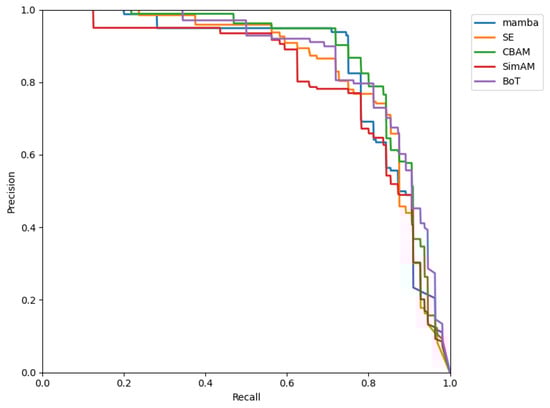 Figure 14 demonstrates that the detection results align with the data obtained in Table 4. However, the model effect of the SimAM module with the addition of the SE modules does not perform as well as benchmark models. Conversely, the model with the addition of CBAM and BoT3 exhibits enhanced detection.